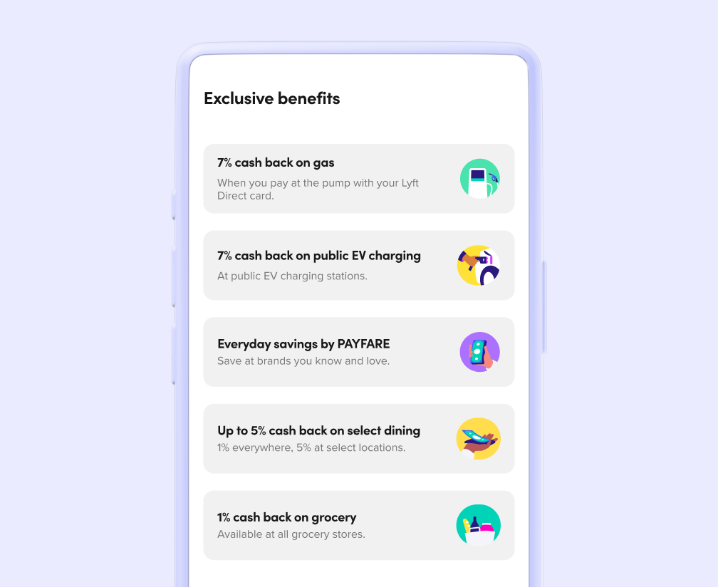 Gas, grocery, restaurant and public EV charging merchant classification is subject to Mastercard rules. For cash back on gas, only payments made at the pump are eligible as payment inside the gas station is not generally eligible for cash back. Cashback rewards are earned for select purchases using your Lyft Direct business debit card and become available for redemption as those purchases settle. You will become ineligible for select cash back rewards if you have not received a Lyft payout into your Lyft Direct business account in the previous 90 days. Payments via third-party apps are not eligible for cash back. Use your Lyft Direct business debit card to pay. Reward categories and amounts subject to change without notice.