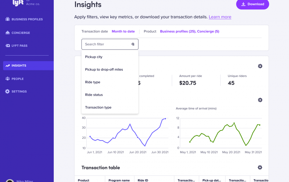 We want to make analyzing your transportation data easier on you. That’s why we’re introducing Insights: a brand new dashboard within the Lyft Business Portal that allows you to monitor data about your transportation programs.
